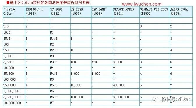 備注: 1963年,美國出了個(gè)潔凈室標(biāo)準(zhǔn)FED-STD-209,在這項(xiàng)標(biāo)準(zhǔn)中,按每立方英尺中≥0.5μm粉塵數(shù)量的最高允許濃度,將潔凈室分成若干等級,如100級、1000級、10000級。長期以來,世界上許多國家都是按這個(gè)方法分級的,中國過去的潔凈室標(biāo)準(zhǔn)也是按這個(gè)方法分級的。